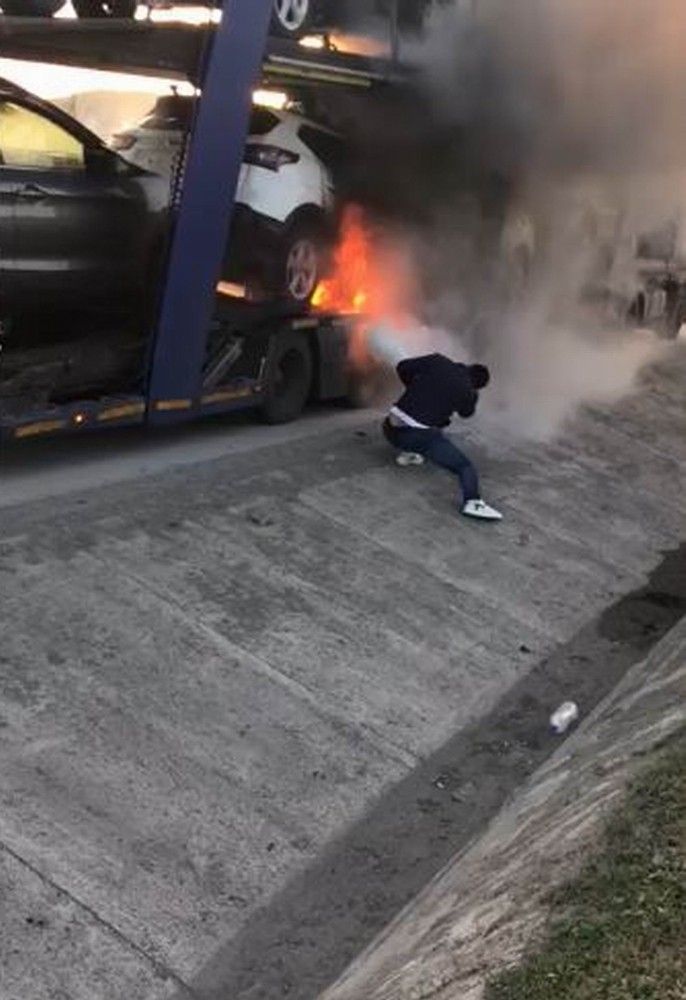 Lüks sıfır araç yüklü tırı vatandaşlar yanmaktan kurtardı