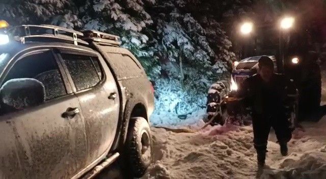 Telefonun kamerasıyla mahsur kaldıkları anı görüntüleyen Gölkan Aykut, "Topuk Yaylası'ndan, Abant Gölü'ne giderken aracımızla yolda mahsur kaldık. Akçam üstü saat 17.30 gibi buradaydık. Saat gece 01.00'a yaklaştı halen buradayız. Tipi var, aracımız arazi aracı olmasına rağmen gitmiyor. Şehir merkezine inmeye çalıştık inemedik. Her yerde ayılar var, bizi takip ettiler. Kar gittikçe şiddetini arttırıyor. Henüz bizi bulamadılar. Aracımız kara saplandı çıkamıyoruz. 7 saattir buradayız. Mazotumuz azaldı bitmek üzere. Şarjlarımız da bitiyor. Kötü durumdayız. Emniyet güçlerine haber verdik. Kurtarılmayı bekliyoruz" dedi.