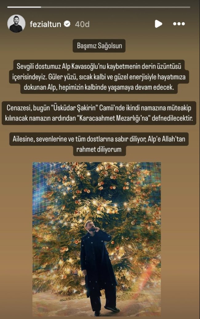 Cenazesi bugün Üsküdar Şakirin Camii'nde ikindi namazına müteakip kılınacak namazın ardından Karacaahmet Mezarlığı'na defnedilecektir. Ailesine, sevenlerine ve tüm dostlarına sabır diliyor, Alp'e Allah'tan rahmet diliyorum."