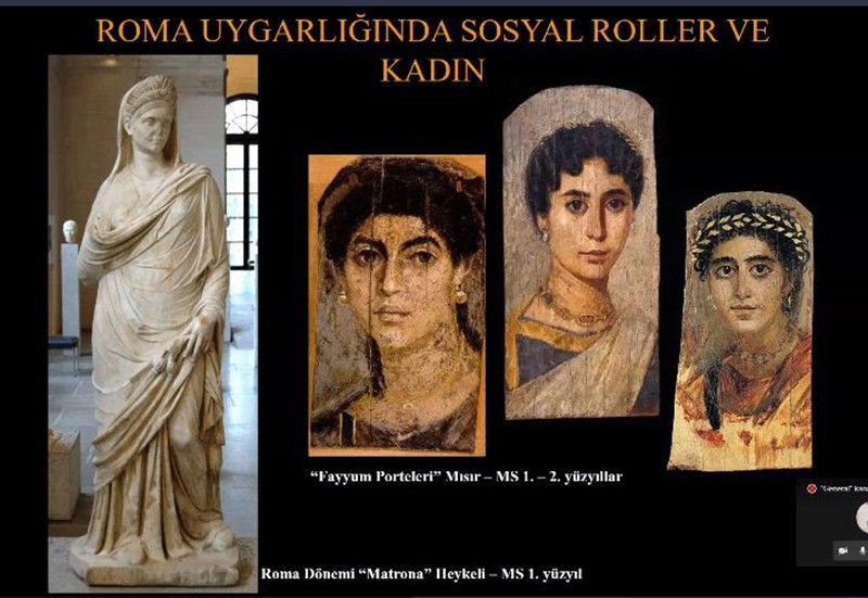 Şakar online konferansında 'Tarih öncesi dönemlerle, ilk tarih çağlarında kadın', 'Hellen Uygarlığında sosyal roller ve kadın', 'Roma uygarlığında sosyal roller ve kadın' ile 'Öteki kadınlar: Heteiralar-Groteskler' konu başlıklarında bilgiler paylaştı.