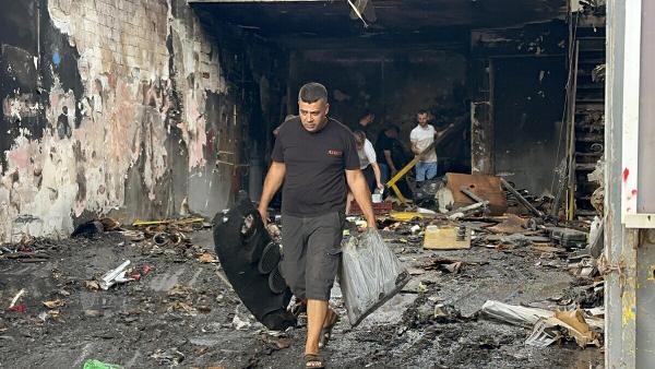 Yangında iş yerleri zarar gören esnaf ve yakınları bu sabah temizlik çalışması başlattı. Zarar görmeyen eşya ve malzemeler, ayrılarak kamyonlara yüklendi.