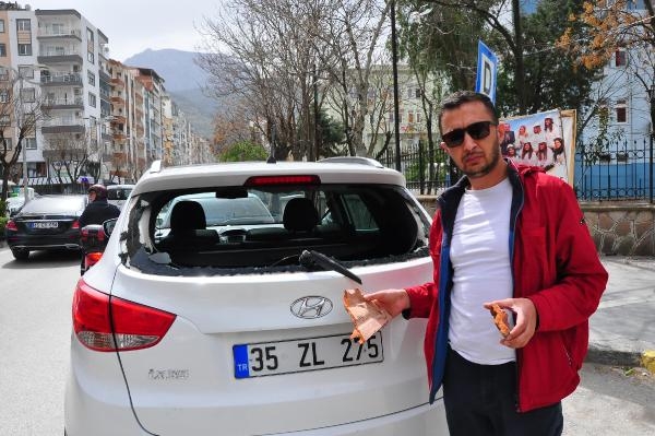 Kiremitlerin düşmesi sonucu arka camı patlayan otomobilin sahibi Onur Mutlu, "Otomobilimde yaklaşık 6 bin liralık zarar var. Cana geleceğine mala gelsin" dedi. Öte yandan kum fırtınası nedeniyle vatandaşlar yolda yürümekte güçlük çekti. (DHA)