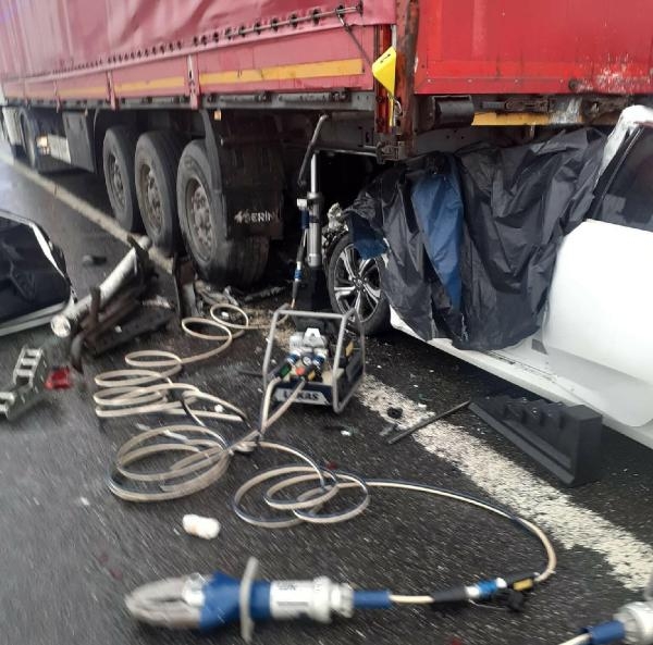 Kaza, saat 14.00 sıralarında İzmir- İstanbul Otoyolunun Saruhanlı- Akhisar bölümü 15'inci kilometresinde meydana geldi. Ferit Özpolat yönetimindeki 07 ANZ 857 plakalı otomobil, yağış nedeniyle kayganlaşan yolda sürücüsünün direksiyon kontrolünü yitirmesi sonucu, aynı yönde ilerleyen Ali Bozgeyik'in kullandığı 01 ADV 168 plakalı TIR'ın dorsesine arkadan çarptı. Çarpmanın şiddetiyle otomobil TIR'ın altına girerken, sürücü Ferit Özpolat ile araçtaki İzzet Özpolat kaza yerinde yaşamını yitirdi, Ukrayna uyruklu Valerııa Surzhenko (29) ile henüz kimliği belirlenemeyen 1 kadın yaralandı. Çevredekilerin ihbarı üzerine kaza yerine sağlık, itfaiye, jandarma ve polis ekipleri sevk edildi. Durumu ağır olan 2 kadın, sağlık ekiplerince Akhisar Mustafa Kirazoğlu Devlet Hastanesi'ne kaldırılıp, tedaviye alındı.