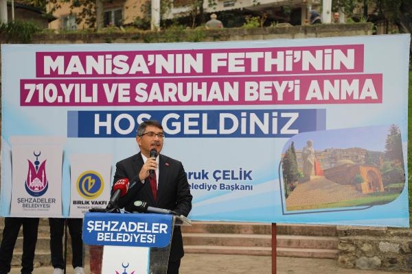 Şehzadeler Belediye Başkanı Ömer Faruk Çelik de konuşmasında bu hafta Manisa'da iki büyük coşkunun bir arada yaşandığını ifade edip, Bu hafta Cumhuriyetimizin 100'üncü yılını coşkuyla kutluyoruz. Manisa'mız için ikinci bir önemi de Manisa'nın fethinin 710'uncu yıl dönümü olmasıdır. Saruhan Bey ve alpleri uzun uğraşlar neticesinde Manisa'yı fethetmişlerdir. İşte biz bugün vefamızı, tarihimizi unutmadığımızı göstermek için Saruhan Bey'in türbesinin başındayız. Saruhan Bey ve alplerini, Manisa'yı İslam yurdu kılan tüm geçmişimizi rahmet, şükran ve minnetle anıyoruz" dedi.