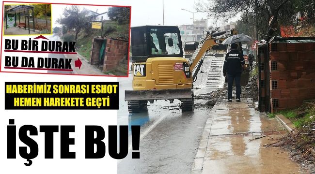 Bu sabah İzmir Büyükşehir Belediyesi Eshot Genel Müdürlüğü ekipleri tuğladan yapılan durağın yerine kapalı durak yapılması için kaldırımdaki yerleri kazdı. Vatandaş kısa sürede durak sorunlarını çözen belediye yetkililerine teşekkür etti.
