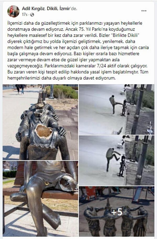 Heykellere yapılan saldırı nedeniyle duyduğu üzüntüyü sosyal medyadan dile getiren Dikili Belediye Başkanı Adil Kırgöz, "İlçemizi daha da güzelleştirmek için parklarımızı yaşayan heykellerle donatmaya devam ediyoruz. Ancak 75'inci Yıl Parkı'na koyduğumuz heykellere maalesef bir kez daha zarar verildi. Bizler 'Birlikte Dikili' diyerek çıktığımız bu yolda ilçemizi geliştirmek, yenilemek, daha modern hale getirmek ve her açıdan çok daha ileriye taşımak için canla başla çalışmaya devam ediyoruz. Bazı kişiler ısrarla bazı hizmetlere zarar vermeye devam etse de güzel işler yapmaktan asla vazgeçmeyeceğiz. Parklarımızdaki kameralar 7/24 aktif olarak çalışıyor. Bu zararı veren kişi tespit edilip, hakkında yasal işlem başlatılmıştır. Tüm hemşehrilerimizi daha duyarlı olmaya davet ediyorum" dedi.
