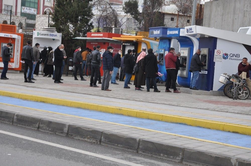 Mardin'de vatandaşların banka ve ATM önlerindeki kalabalığı bitmek bilmiyor. Kentte vatandaşlar, işlem yapmak için gittikleri bankaların önlerinde korona virüs tedbirlerini hiçe sayıyor. Banka önünde bekleyen vatandaşların birçoğu maske takmazken, sosyal mesafeye de uyulmuyor.