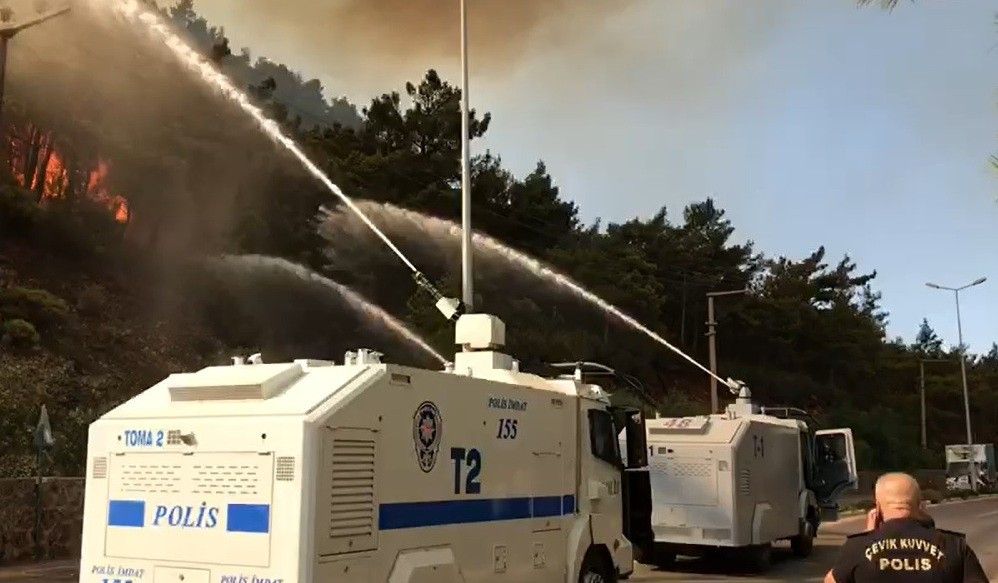 Muğla'nın Marmaris ilçesinde çıkan orman yangını yola doğru ilerleyince Marmaris-İçmeler Karayolu trafiğe kapatıldı. Yangın söndürme ekiplerine Muğla İl Emniyet Müdürlüğü'ne bağlı TOMA araçları da destek veriyor.