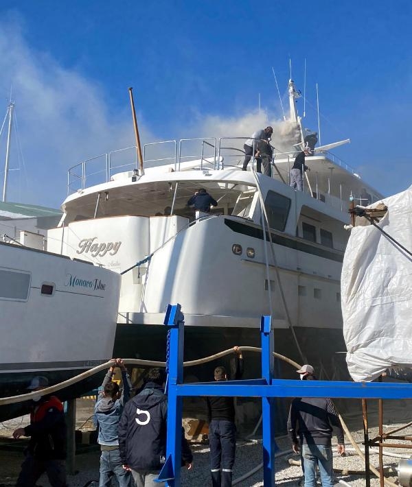 MUĞLA'nın Marmaris ilçesinde özel bir marinada, karada bakımı yapılan 20 metrelik 'Happy Avatiu' isimli lüks yatta yangın çıktı. Alevler çevreye sıçramadan söndürülürken, yatta hasar oluştu.
