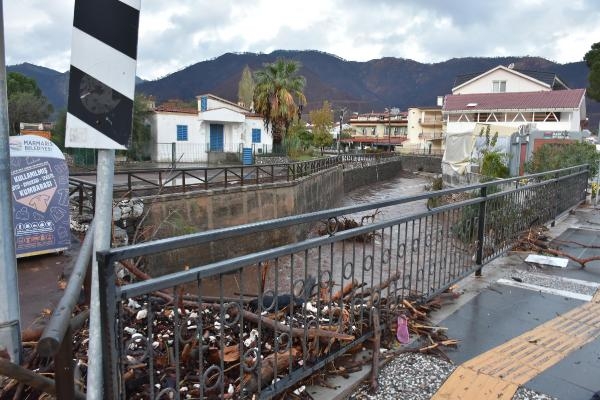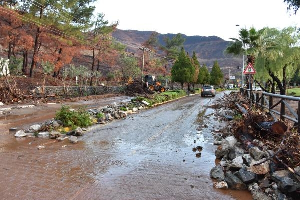 Marmaris'de dün aralıklı devam eden sağanak saat 22.30 sıralarında şiddetini artırdı. Marmaris'e 11 kilometre mesafedeki turistik İçmeler Mahallesi'nde yaz ayında yanan ormanlık alanlardan inen çamurlu sular dereleri taşırdı. Cadde ve sokaklar dereye döndü. Yağmur nedeniyle tepelerdeki, gevşeyen toprak ve kaya parçaları ve yanan alanlardaki kesim yapılan bölgelerdeki tomruk ve dal parçaları Marmaris-İçmeler kara yoluna dökülerek, trafiğin kapanmasına neden oldu. Kayabal ve Gölbaşı Caddesi'nde derelerin taşmasıyla zemin katlardaki evleri su bastı. Park halindeki çok sayıda araç sel sularına kapılıp, suyla doldu. Palmiye ağaçları devrildi, enerji nakil hatlarının zarar görmesiyle elektrikler kesildi. Polis ekipleri çevre güvenliği alırken yolda kalan araçları kurtardı. Marmaris Belediyesi temizlik ile zabıta ve Muğla Büyükşehir Belediyesi Su ve Kanalizasyon İdaresi Müdürlüğü (MUSKİ) ekipleri yağmur altında çalışma başlattı. İş makineleri karayolunu kaplayan çamurları temizledi. Kara yoluna düşen tomruklar kaldırıldı.