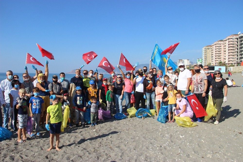 Antalya'nın Alanya ilçesinde yerleşik yaşayan çoğunluğu Rus yaklaşık 150 yabancı, 'Temiz çevre, yeşil doğa için ele elle' etkinliği kapsamında denize girmek yerine sahillerde çöp topladı.