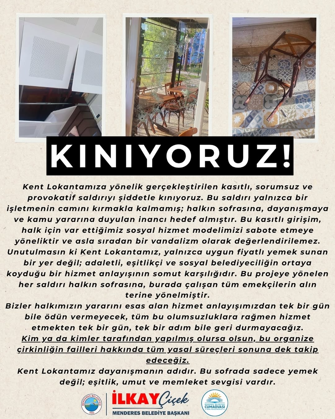 Menderes’te bulunan Kent Lokantası’na gerçekleştirilen kasıtlı ve provokatif saldırı, sosyal medya üzerinden yetkililer tarafından sert şekilde kınandı. Yapılan açıklamada, saldırının sadece işletmenin camını kırmakla kalmayıp, halkın sofrasına, dayanışmaya ve kamu yararına olan inancı hedef aldığı belirtildi.