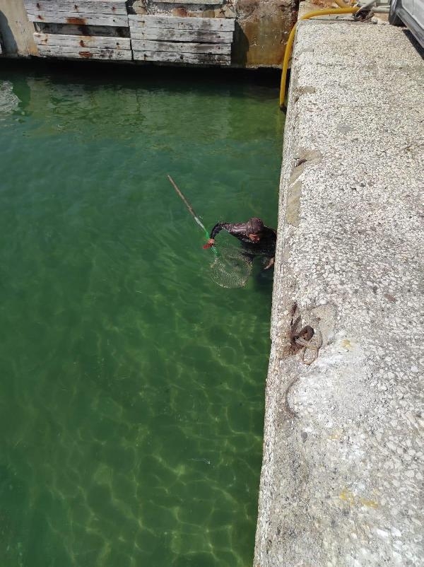 Mendirek altına sıkışan kediyi dalgıçlar kurtardı