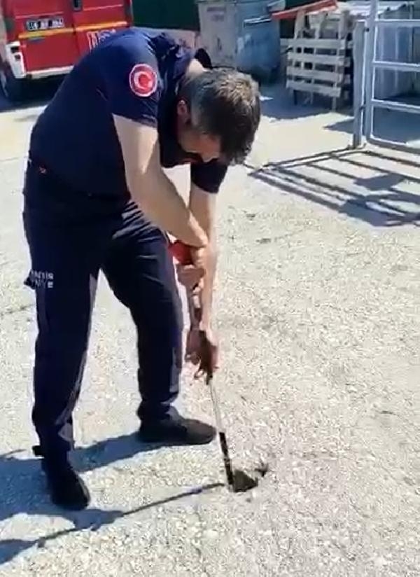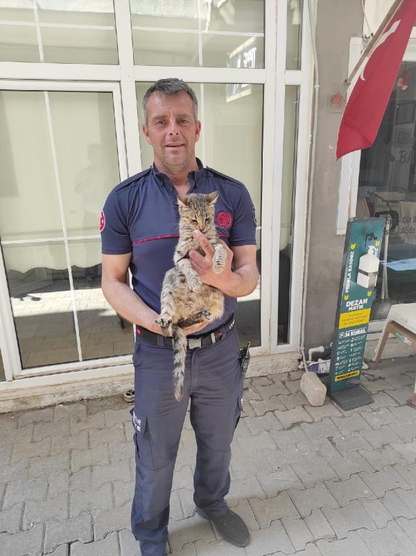 BALIKESİR'de, mendirek altındaki kayalara sıkışan gebe kedi, denizin dalgalı oluşu nedeniyle kurtarılamadı. 1 hafta havalandırma deliğinden bakılarak kontrol edilen kedi, dalga etkisini kaybedince dalgıç kıyafetiyle denize giren itfaiyeci Muhittin Çapa tarafından kurtarıldı.