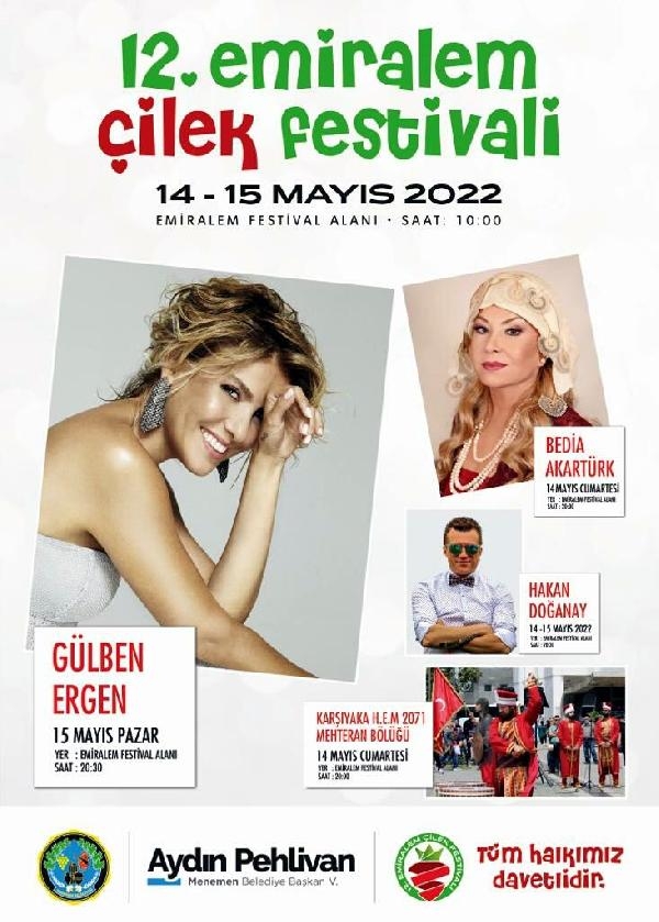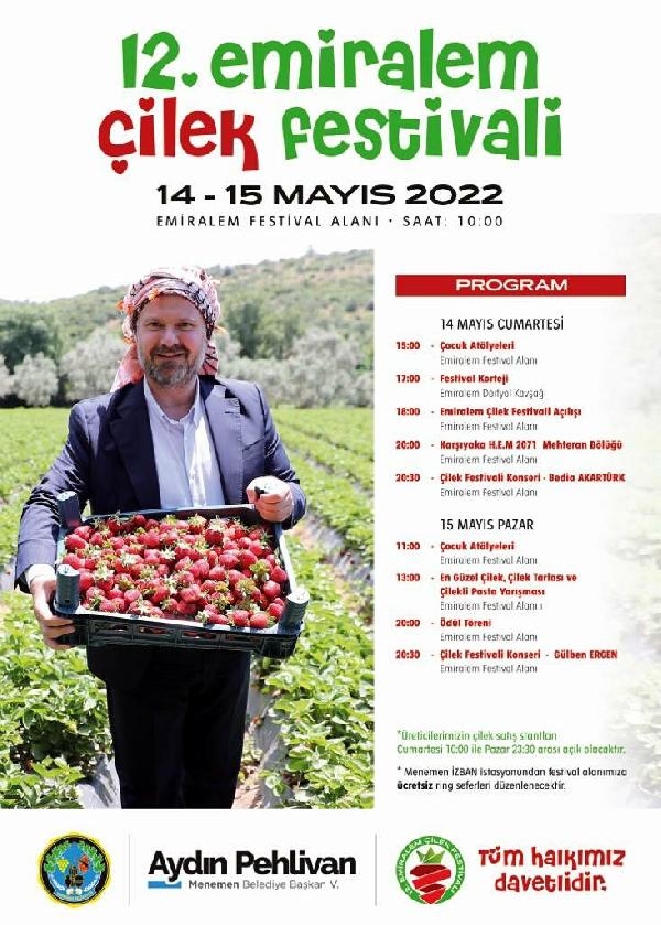 İZMİR'n Menemen ilçesinin kendine has tadı ve kokusuyla ünlü Emiralem çileğinin hasat mevsimi kapsamında gerçekleştirilecek 12'nci Çilek Festivali'nin 14-15 Mayıs tarihleri arasında düzenleneceği bildirildi. 'Çilek Tadında Festival' sloganı adı altındaki festivalde ünlü türkücü Bedia Akartürk ve şarkıcı Gülben Ergen de birer konser verecek. Menemen Belediye Başkan Vekili Aydın Pehlivan, herkesi festivale davet etti.