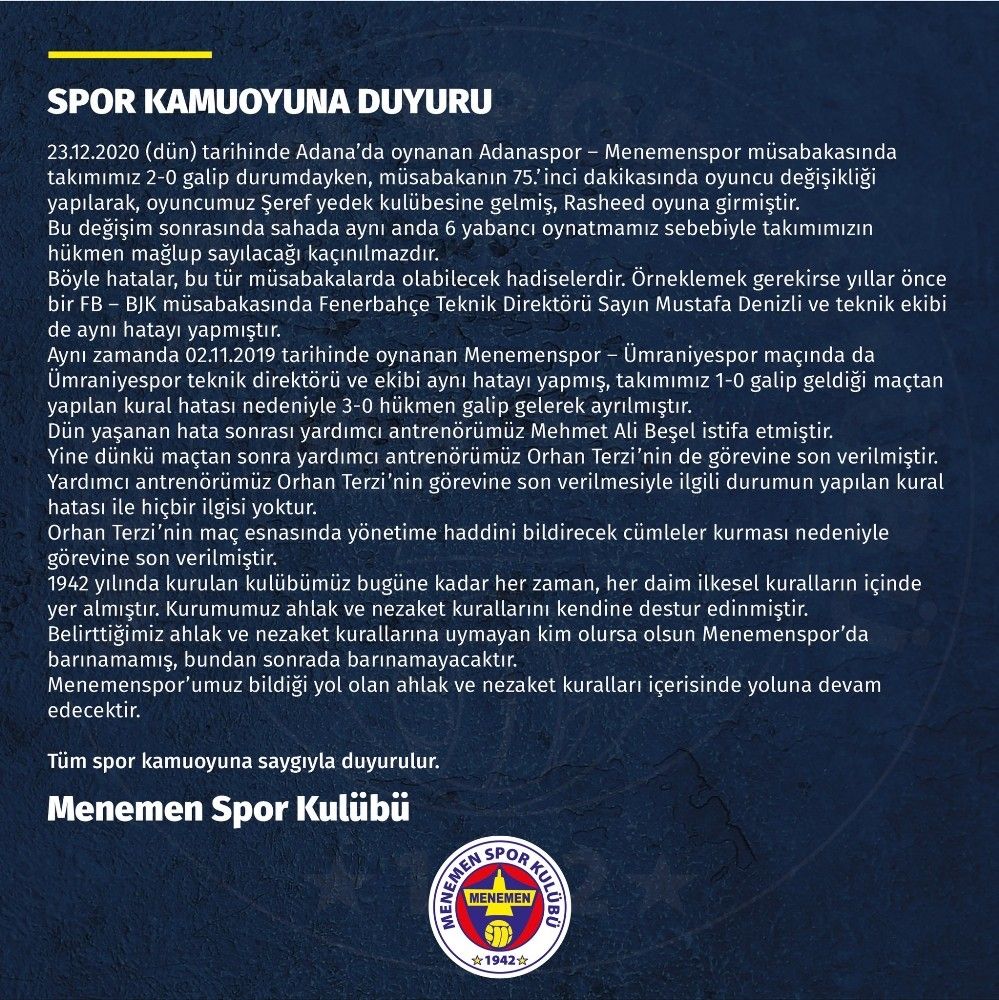 Menemenspor, TFF 1. Lig'in 15. haftasında deplasmanda Adanaspor'u 3-2 mağlup etmesine karşın maçın bir bölümünde sahada 6 yabancı bulundurmasından dolayı kural hatası yapmıştı. Hükmen mağlup sayılması beklenen Menemenspor'da, yardımcı antrenör Orhan Terzi'nin görevine maçın ardından son verilmişti. Orhan Terzi, sosyal medya hesabından yaptığı açıklamada günah keçisi ilan edildiğini söyleyerek, "Yapmadığım bir hatadan dolayı otelden atıp, uçak biletimi iptal ettiler" ifadelerini kullanmıştı. Bu paylaşımın üzerine birçok futbolsever Menemenspor yönetimine sosyal medya üzerinden tepki gösterdi. Yaşananların ardından Menemenspor'dan konuyla ilgili sosyal medya hesaplarından bir açıklama geldi. Sarı-lacivertli kulüp, açıklamasında şu ifadelere yer verdi: