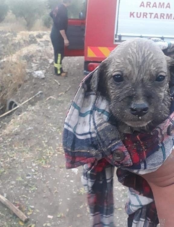 Menfezde mahsur kalan yavru köpekler kurtarıldı