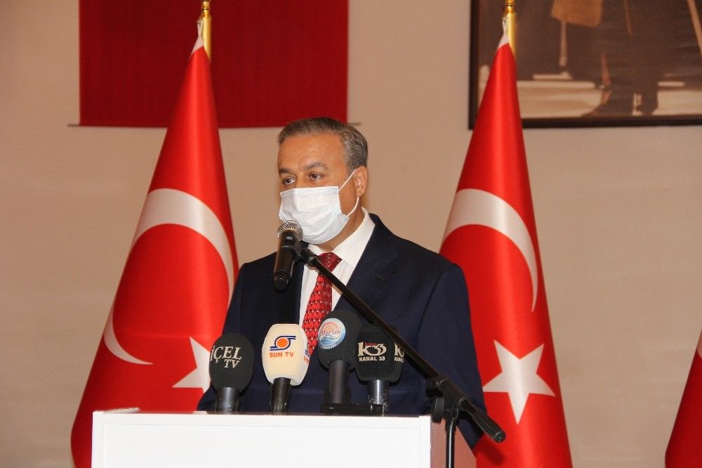 Mersin'de 29 Ekim Cumhuriyet Bayramı dolayısıyla Kültür Merkezi Şeref Salonunda tebrik töreni düzenlendi. Korona virüs önlemleri çerçevesinde maskelerle gerçekleştirilen törene, Mersin Valisi Ali İhsan Su, Mersin milletvekilleri Hacı Özkan, Alpay Antmen, Baki Şimşek ve Olcay Kılavuz, Akdeniz Bölge ve Garnizon Komutanı Tuğamiral Fuat Gedik, Büyükşehir Belediye Başkanı Vahap Seçer, il protokolü, gaziler ile sivil toplum kuruluşlarının temsilcileri katıldı.