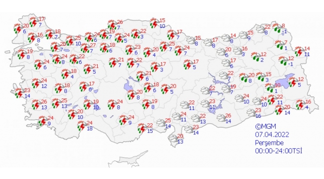 Verilere göre Marmara, Ege, İç ve Batı Akdeniz, İç Anadolu, Karadeniz ile Doğu Anadolu'nun kuzey ve doğusunun aralıklı sağanak ve yer yer gök gürültülü sağanak yağışlı geçeceği ifade edildi.