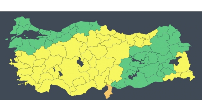 Adana, Afyonkarahisar, Amasya, Ankara, Antalya, Aydın, Burdur, Çankırı, Çorum, Denizli, Eskişehir, Giresun, Gümüşhane, Hakkari, Isparta, Mersin, İzmir, Kayseri, Kırşehir, Konya, Kütahya, Manisa, Kahramanmaraş, Muğla, Nevşehir, Niğde, Ordu, Rize, Samsun, Sivas Tokat, Trabzon, Uşak, Van, Yozgat, Aksaray, Bayburt, Karaman, Kırıkkale, Şırnak ve Osmaniye için sarı kodlu uyarı yapılırken, Hatay için turuncu kod verildi.