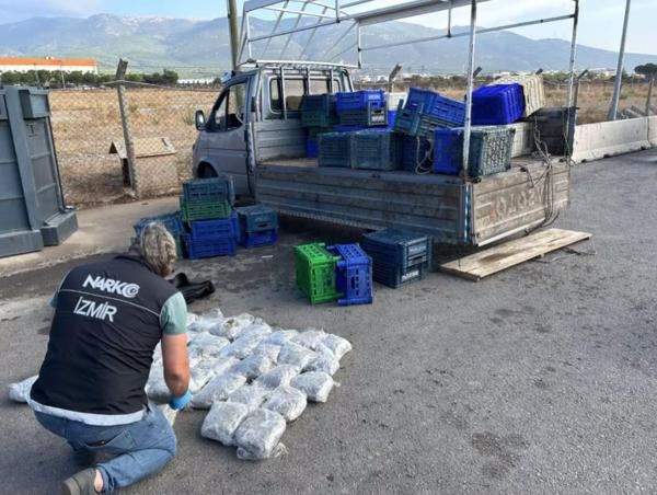 İzmir'in Kemalpaşa ilçesinde, kamyonette, meyve kasalarının altına gizlenmiş 21 kilo 550 gram skunk ele geçirildi.