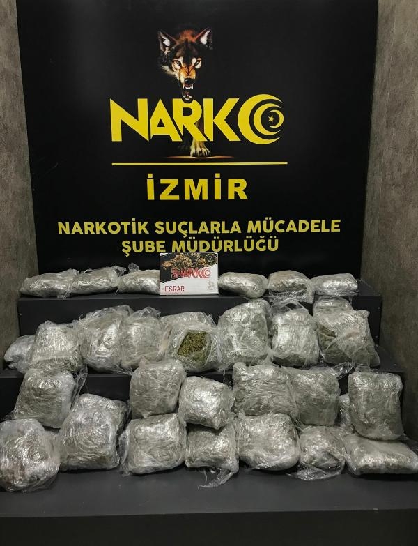 İl Emniyet Müdürlüğü Narkotik Suçlarla Mücadele Şube Müdürlüğü ekipleri tarafından İzmir'e şehir dışından uyuşturucu getirileceği tespit edildi. Takiple, şüphelinin içinde olduğu kamyonet, Kemalpaşa girişinde durduruldu. Özel eğitimli narkotik köpeğiyle kamyonette yapılan aramada meyve kasalarının altına gizlenmiş 21 kilo 550 gram skunk ele geçirildi. Kamyonetteki 1 kişi gözaltına alındı. Polisteki işlemlerinin ardından adliyeye sevk edilen şüpheli, çıkarıldığı mahkeme tarafından tutuklandı. (DHA)