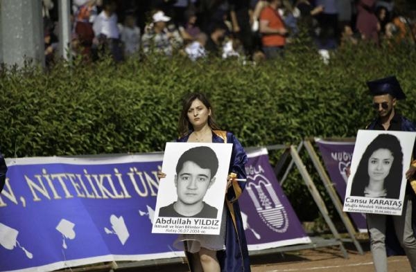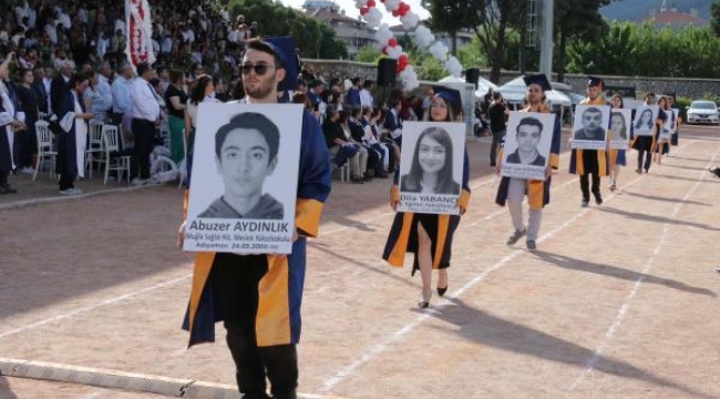 MUĞLA Sıtkı Koçman Üniversitesi'nin (MSKÜ) mezuniyet töreninde, öğrenciler, Kahramanmaraş merkezli depremlerde ölen arkadaşlarının fotoğraflarını taşıdı.