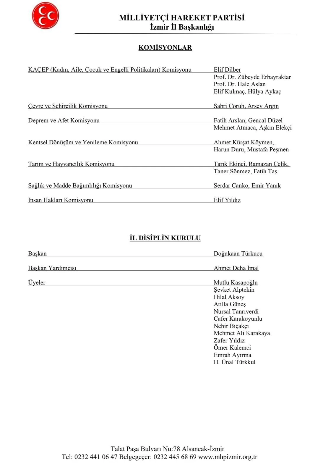 Milliyetçi Hareket Partisi İzmir İl Başkanlığı yeni başkanlık divanı açıkladı. Bugün akşam İl Teşkilatında düzenlenen olağan il yönetim kurulu toplantısında yeni Başkanlık divanını açıklayan İl Başkanı Veysel Şahin’in divanında Profesörlerin olması dikkat çekti.