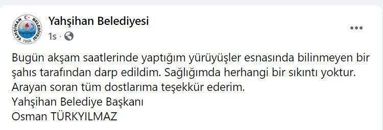 İHA muhabirine yaşadığı anları anlatan Yahşihan Belediye Başkanı Osman Türkyılmaz, ilçede saha çalışmalarını denetleme sırasında kimliği belirsiz kişi tarafından saldırıya uğrayıp, darp edildiğini söyledi. Sağlığında herhangi bir sıkıntı olmadığını ifade eden Türkyılmaz, şunları kaydetti: