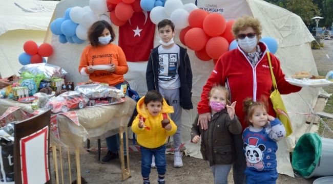 Depremden en çok etkilenen Bayraklı ve Bornova bölgesindeki çadır alanlarında görev yapan İzmir Büyükşehir Belediyesi ekipleri depremzedelerin yaşamını kolaylaştırmak için 24 saat görev yapıyor. Yaşanan travmanın izlerini silmeyi ve moralleri yükseltmeyi hedefleyen Büyükşehir Belediyesi çalışanları Bayraklı Mansuroğlu Mahallesi 75. Yıl Parkı'ndaki çadırlarda kalan Kaya ailesine hoş bir sürpriz yaptı. Depremzede ailenin minik üyesi Mustafa Kazım Kaya'nın dört yaşına gireceğini öğrenen İzmir Büyükşehir Belediyesi Gençlik ve Spor Dairesi Başkanlığı personeli ailenin kaldığı çadırın önünde sürpriz doğum günü partisi düzenledi.