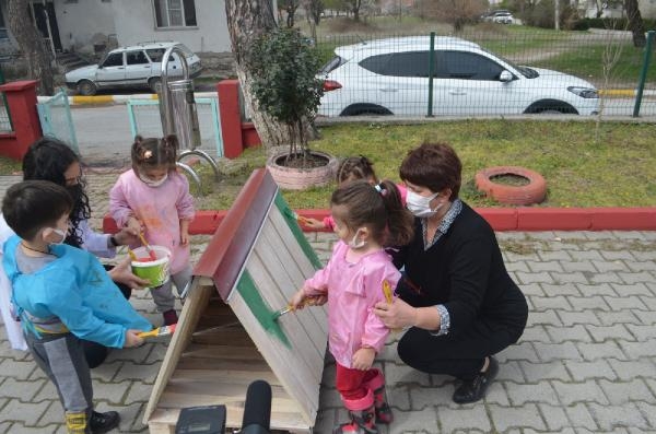 BALIKESİR'in Savaştepe ilçesinde anaokulu öğrencileri, 'Patiler ve Minik Eller Buluşuyor' projesi kapsamında, sokak köpekleri ve kedileri için yapılan kulübeler ile kuş kafesleri ve mama kaplarını boyadı.