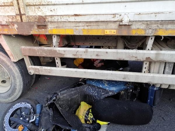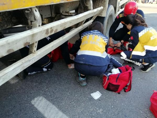 Motosikletli, çarpıştığı kamyonun altında kaldı