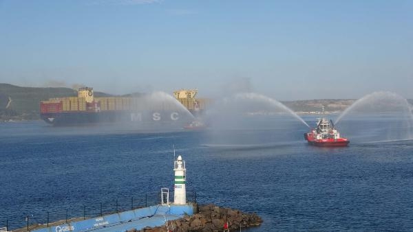 Dev konteyner gemisi saat 10.10 sıralarında Çanakkale önlerine ulaştı. Kilitbahir Kalesi ile Kilitbahir Köyü Dağı'ndaki 'Dur Yolcu' yazısının önünden geçen 'MSC Türkiye', Nara Burnu'nu döndükten sonra Tekirdağ Limanı'na doğru yol aldı. 'MSC Türkiye' gemisine boğaz geçişi sırasında Kıyı Emniyeti Genel Müdürlüğü'ne bağlı çok sayıda römorkör eşlik etti. Römorkörler su gösterisiyle gemiyi selamladı. Dev geminin geçişi sırasında güvenlik gerekçesiyle Çanakkale Boğazı kuzeyden güneye saat 07.00 ile saat 12.30 arası trafiğe kapatıldı. (DHA)