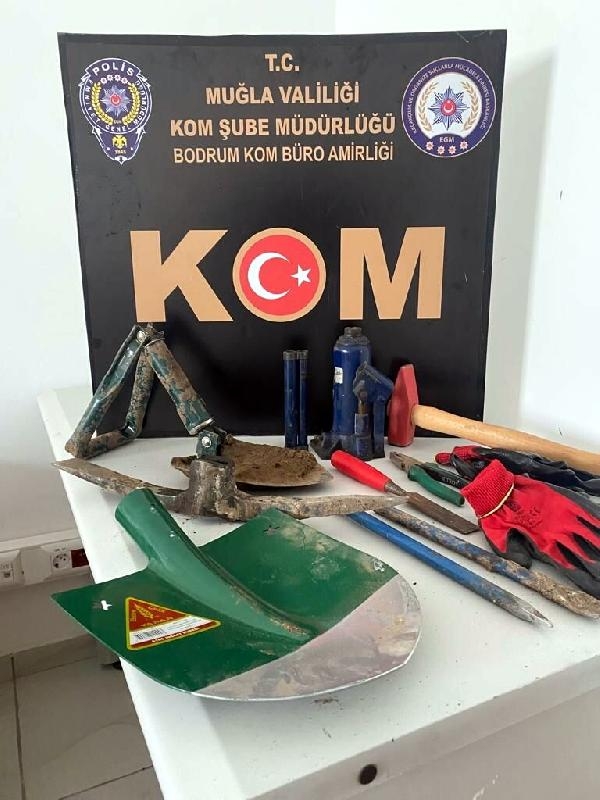 İlçe Emniyet Müdürlüğü Kaçakçılık ve Organize Suçlarla Mücadele Büro Amirliği ekipleri, Göktepe mevkisinde kaçak tarihi eser kazısı yapıldığı yönünde ihbar aldı. Harekete geçen polis, Bodrum Antik Tiyatrosu'nun güney yamacına yaslanan Göktepe'nin üst bölümlerinde kaya içine oyulmuş, zengin ailelere ait çok sayıda oda mezarların bulunduğu bölgeye operasyon düzenledi. Baskında M.Ö. ile C.Ö. suçüstü yakalandı. Kaçak kazıda kullanılan 2 kürek, 1 kriko, 1 demir kazma, 2 balyoz keskisi, 1 pense ve 1 çekice el konuldu. Şüpheliler hakkında yasal işlem başlatılmak üzere tutanak tutuldu. (DHA)