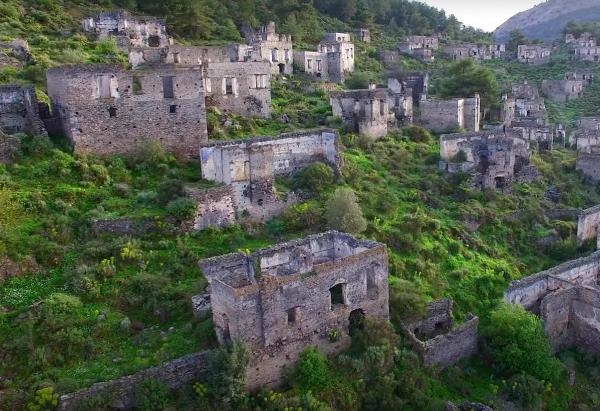 MUĞLA'nın dünyaca ünlü turistik ilçesi Fethiye'de 'hayalet köy' olarak bilinen ve 65 yıl önce terk edilen Kayaköy, havadan görüntülendi.