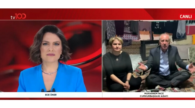 Muharrem İnce ise Kılıçdaroğlu'nun tam tersi açıklamalar yapıyor. İnce, Hatay'da bir ailenin çadırına misafir olup TV100 ekranlarında Ece Üner ile Ana Haber'e bağlandı.