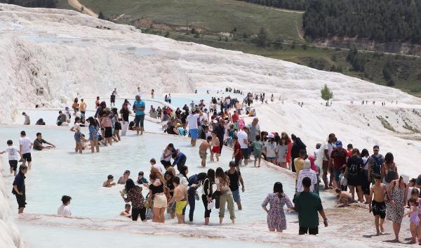 DENİZLİ'de UNESCO Dünya Kültür Mirası listesinde yer alan Pamukkale'ye, Uluslararası Dünya Müzeler Günü nedeniyle girişler ücretsiz yapıldı. Ziyaretçi akınına uğrayan Pamukkale'de, vatandaşlar beyaz travertenlerden akan sıcak suya yalın ayak girerek keyif yaşadı.