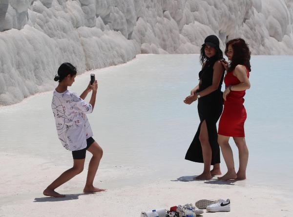 'Beyaz Cennet' olarak bilinen Pamukkale'ye Uluslararası Müzeler Günü kapsamında girişler bugün ücretsiz oldu. Çok sayıda vatandaş Pamukkale'ye akın etti. Gelen ziyaretçiler, beyaz travertenler üzerinde akan sıcak suda yalın ayak yürümenin keyfini yaşadı. Sıcak suyla temas eden çocuklar büyük keyif yaşarken, yetişkinler ise travertenler üzerinde bol bol hatıra fotoğrafı çektirdi. Pamukkale Ören Yeri'ne bugün saat 08.00'den bu yana, 6 bin 900 kişinin ziyaret ettiği öğrenilirken, ören yeri, saat 23.00'e kadar ücretsiz gezilebilecek.