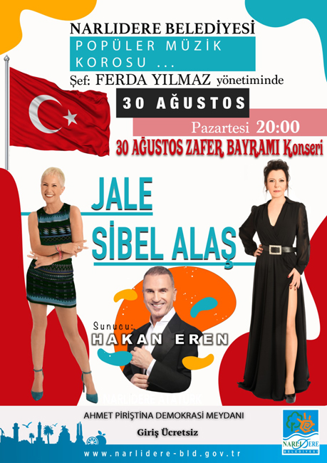 Narlıdere Belediyesi, 30 Ağustos Zafer Bayramı’nın yıl dönümünde coşkulu bir kutlamaya ev sahipliği yapacak. Pazartesi günü, saat 20.00’de, Ahmet Piriştina Demokrasi Meydanı’nda gerçekleşecek konserde ünlü sanatçılar Sibel Alaş ve Jale sahne alacak. Başkan Ali Engin “Zafer Bayramımızın coşkusunu birlikte yaşamak için herkesi 30 Ağustos’ta meydanlara bekliyoruz” dedi.