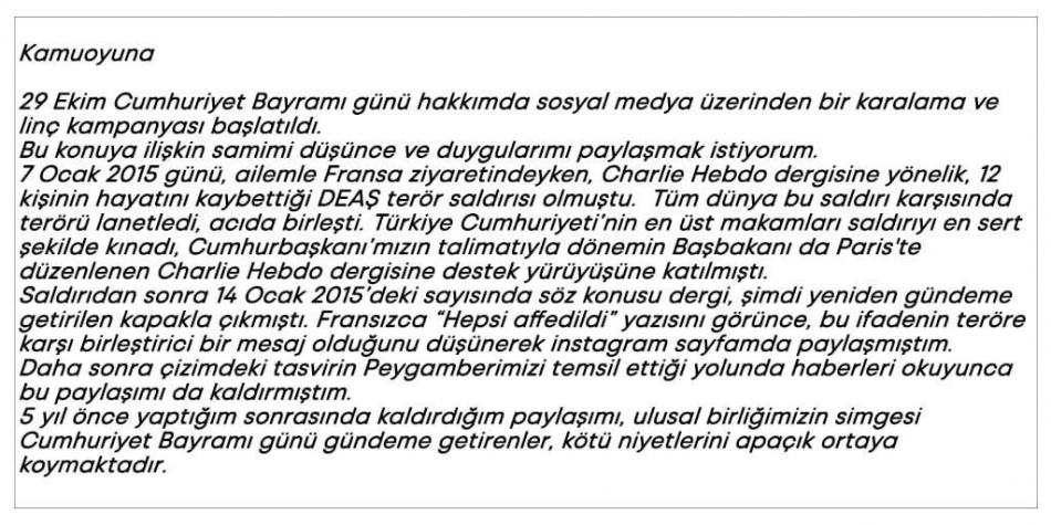 “29 Ekim Cumhuriyet Bayramı günü hakkımda sosyal medya üzerinden bir karalama ve linç kampanyası başlatıldı. Bu konuya ilişkin samimi düşünce ve duygularımı paylaşmak istiyorum. 7 Ocak 2015 günü, ailemle Fransa ziyaretindeyken, Charlie Hebdo dergisine yönelik, 12 kişinin hayatını kaybettiği DEAŞ terör saldırısı olmuştu. Tüm dünya bu saldırı karşısında terörü lanetledi, acıda birleşti. Türkiye Cumhuriyeti'nin en üst makamları saldırıyı en sert şekilde kınadı, Cumhurbaşkanı'mızın talimatıyla dönemin Başbakanı da Paris'te düzenlenen Charlie Hebdo dergisine destek yürüyüşüne katılmıştı. Saldırıdan sonra 14 Ocak 2015'deki sayısında söz konusu dergi, şimdi yeniden gündeme getirilen kapakla çıkmıştı. Fransızca "Hepsi affedildi" yazısını görünce, bu ifadenin teröre karşı birleştirici bir mesaj olduğunu düşünerek Instagram sayfamda paylaşmıştım. Daha sonra çizimdeki tasvirin Peygamberimizi temsil ettiği yolunda haberleri okuyunca bu paylaşımı da kaldırmıştım.