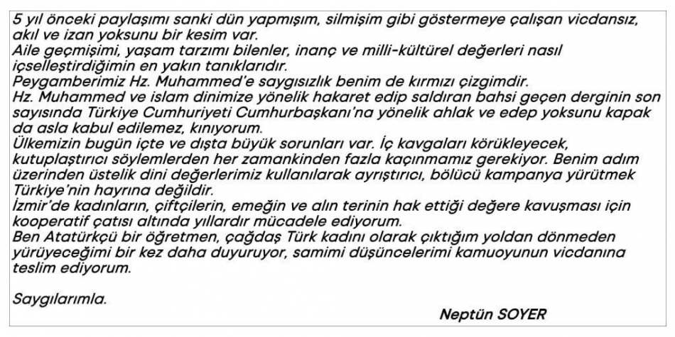 5 yıl önce yaptığım sonrasında kaldırdığım paylaşımı, ulusal birliğimizin simgesi Cumhuriyet Bayramı günü gündeme getirenler; kötü niyetlerini apaçık ortaya koymaktadır. 5 yıl önceki paylaşımı sanki dün yapmışım, silmişim gibi göstermeye çalışan vicdansız, akıl ve izan yoksunu bir kesim var. Aile geçmişimi, yaşam tarzımı bilenler, inanç ve milli-kültürel değerleri nasıl içselleştirdiğimin en yakın tanıklarıdır. Peygamberimiz Hz. Muhammed'e saygısızlık benim de kırmızı çizgimdir.