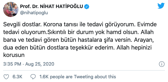 İlahiyatçı Nihat Hatipoğlu, sosyal medya hesabından bir paylaşımdabulunarak, yaptırdığı son test sonucunun pozitif çıktığını açıkladı. Hatipoğlu, paylaşımında, "Sevgili dostlar. Korona tanısı ile tedavi görüyorum. Evimde tedavi oluyorum.Sıkıntılı bir durum yok hamd olsun. Allah bana ve tedavi gören bütün hastalara şifa versin. Arayan, dua eden bütün dostlara teşekkür ederim. Allah hepinizi korusun" ifadelerini kullandı.