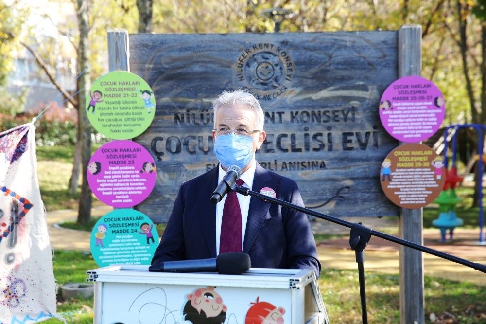 Türkmen'in ardından bir konuşma yapan Nilüfer Belediye Başkanı Turgay Erdem ise, Dünya Çocuk Hakları Günü'nü kutlayarak, kurumsal olarak yeni nesili, çocuk ve gençlerin fikirlerini önemseyen ve onları karar alma süreçlerine dahil eden bir politikayı benimsediklerini söyledi. Çocuk Meclisi Evi'nin aktif kullanımı için gereken desteğin sağlanacağı sözünü veren Erdem, "Çocukların istekleri doğrultusunda, katılımcılık konusunda aktif rol üstlenen tüm çocuklar için bir buluşma merkezi olarak tasarlanan Çocuk Meclisi Evi'nin daha faal kullanılması için yine çocukların üreteceği her projeye destek vereceğiz. Çocukların geleceğe iyi hazırlanmaları için ihtiyaç duyulan eğitimleri almalarını destekliyoruz ve en temelde her çocuğun haklarını öğrenmesini ve bu konuda bilinçlenmesini önemsiyoruz. Bizler her çocuğun temel hak ve özgürlüklere sahip ve fırsat eşitliği içinde, sağlıklı, mutlu ve refah içinde bir hayat sürmesini diliyoruz. Onların ihtiyaçlarını onların gözlerinden görmek ve bu şekilde projeler üretmek bizleri de mutlu ediyor" dedi.