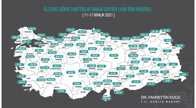 Sağlık Bakanı Fahrettin Koca, sosyal medya hesabından, il bazında her 100 bin nüfusa karşılık gelen Covid-19 vaka sayılarının yer aldığı haritayı paylaştı.