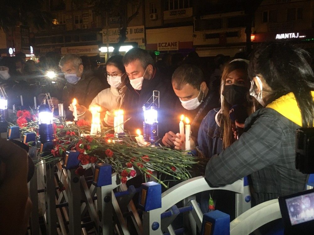 İzmir'de meydana gelen 6,6 büyüklüğündeki depremde çöken Rıza Bey Apartmanı'nda 34 kişi yaşamını yitirmişti. Apartmanda enkaz çalışmaları tamamlanırken, geriye boş bir arazi ve yürek burkan görüntüler kaldı. Onlarca kişi de akşam saatlerinde yıkılan apartmanın önüne geldi. Karanfillerin bırakıldığı alanda mumlar yakıldı. Yıkılan apartman önüne gelen ölenlerin yakınları gözyaşlarına boğuldu. Yakınlarının dakikalarca gözyaşı dökmesi alandaki herkesi duygulandırdı.