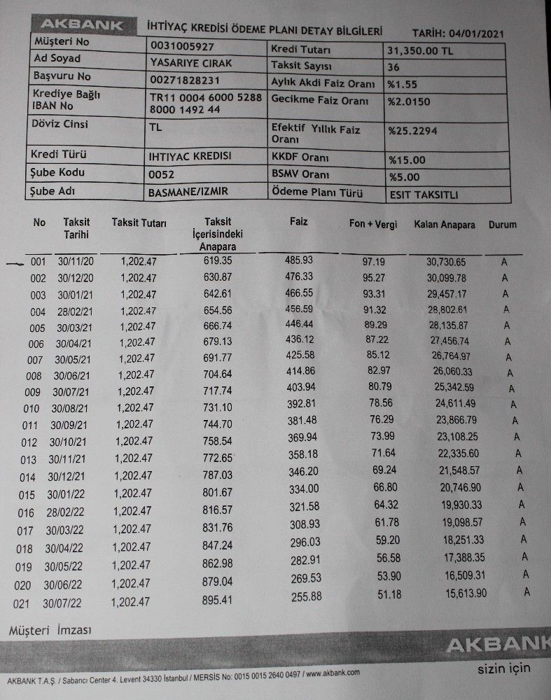 İzmir'de 76 yaşındaki Mustafa Y.'ye bakıcılık yapan ve ölen eşinden aylık alarak geçimini sürdüren 46 yaşındaki Yaşariye Ç. daha önce oğlu için çektiği 3 bin 500 liralık kredi borcu taksidini ödemek için gittiği banka şubesinde hesap harekeleri dökümünü de istedi. Belgeleri görmesiyle şoka uğrayan kadın, 31 bin 350 lira kredi borcunun bulunduğunu ve çekilen kredi miktarının da üç parça halinde gelininin hesabına aktarıldığını anladı. Bunun üzerine oğlu ve gelinini arayan Yaşariye Ç., tatmin edici bir cevap alamazken, soluğu İzmir Cumhuriyet Başsavcılığında aldı. Manisa'da yaşayan oğlu M.C.Ç. ve gelini E.N.Ç. hakkında suç duyurusunda bulunan Yaşariye Ç., "Ben ekim ayında Manisa Salihli'ye oğlum ve gelinimin yanına gitmiştim. Gelinim, torunum oynasın diye cep telefonumu aldı. Ben o sırada dışarıda oturuyordum. Telefonumda bankanın mobil uygulaması vardı. Benim üzerime krediyi o arada çektiklerini düşünüyorum. Şifreyi bilip mobil bankacılığa girmişler. Ben telefonumu verdim ve başıma böyle bir olay geldi. Benim iyi niyetimi suistimal ettiler. Gelinim benim kızım gibiydi, ben onların düğün fotoğraflarını çerçevelettim ve yanıma koydum ama bana bunu yaptılar. Ben onları çok seviyordum, bu bana yapılmazdı. Bu saatten sonra kime güveneceğimi gerçekten bilmiyorum" dedi.