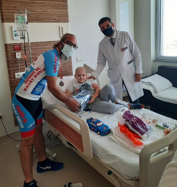 KÖK hücre ve organ bağışı konusunda toplumsal bilinci artırmak amacıyla 10 Ağustos'ta Adana'dan bisikletiyle Türkiye turuna çıkan, Mavi Çocuk Utku Umut Işıkları Derneği'nin kurucusu Kemal Yücel (44), 9 yıl önce beynindeki tümör nedeniyle yaşamını yitiren oğlu Ali Utku'nun (6) doğum gününde, lösemi hastası çocukları sevindirdi.