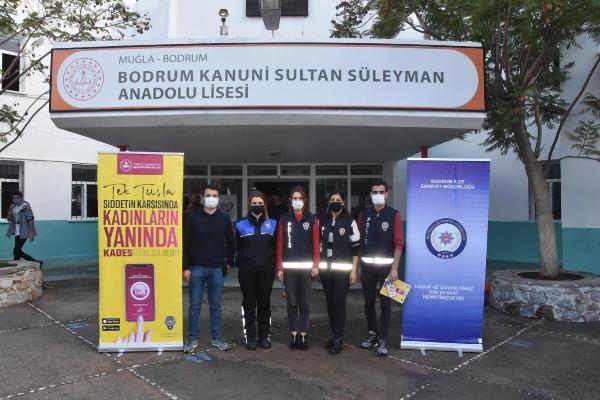 MUĞLA'nın Bodrum ilçesinde, polis ekipleri tarafından liselerde, Kadın Acil Destek (KADES) uygulamasının tanıtımı yapıldı. Öte yandan, Bodrum'da 1 yıl içerisinde KADES üzerinden gelen 600 ihbarın polis ekiplerince çözüme kavuşturulduğu bildirildi.
