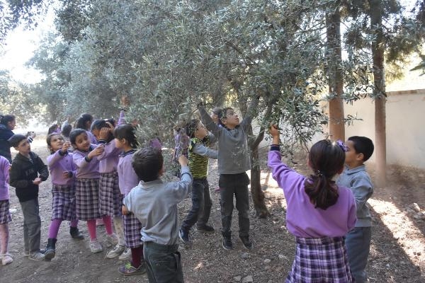 İZMİR'in Menderes ilçesindeki kırsal mahallede yer alan ilkokulun öğrencileri ile velileri, okulun bahçesinde zeytin hasadı yaptı. Yıllar önce öğrenciyken fidan diken bazı velilerin, bugün çocuklarıyla hasat yapması, güzel görüntüler oluşturdu.