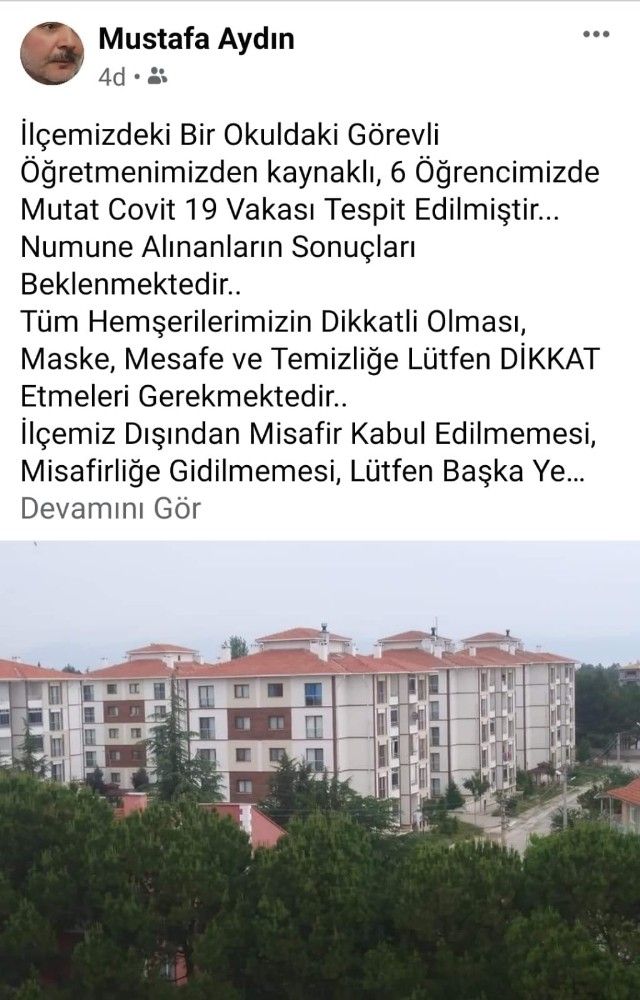 "İlçemizdeki bir okuldaki görevli öğretmenimizden kaynaklı, 6 öğrencimizde mutasyona uğramış Covid-19 vakası tespit edilmiştir. Numune alınanların sonuçları beklenmektedir. Tüm hemşerilerimizin dikkatli olması, maske, mesafe ve temizliğe lütfen dikkat etmeleri gerekmektedir. İlçemiz dışından misafir kabul edilmemesi, misafirliğe gidilmemesi, lütfen başka yerlerde ikamet edenlerinde sabırla biraz daha ilçemize gelmemelerini önemle rica ederiz"